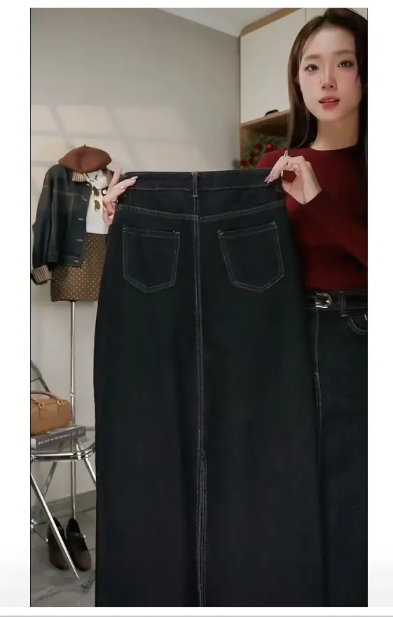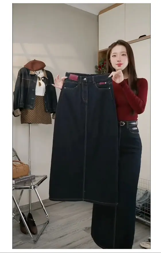 Chân Váy Jean Suông Dài Mác Đỏ – Thanh Lịch & Tôn Dáng